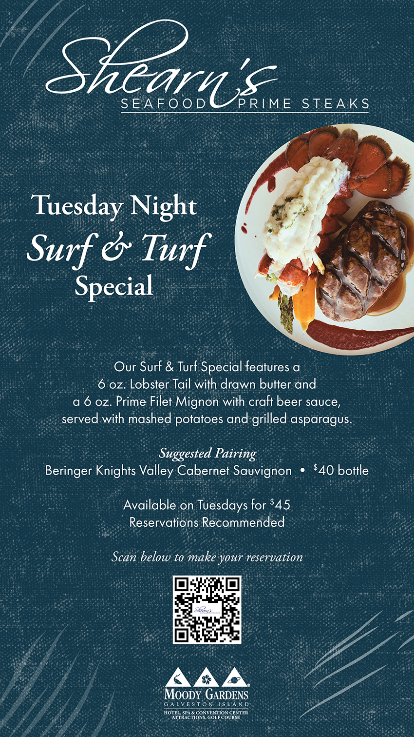 Elevate your Tuesday evening with Shearn’s Seafood & Prime Steaks Tuesday Night Surf and Turf Special. Enjoy a 6 oz. lobster tail served with drawn butter alongside a 6 oz. prime filet mignon topped with craft beer sauce. The entrée is complemented by mashed potatoes and grilled asparagus for a complete, refined dining experience.
